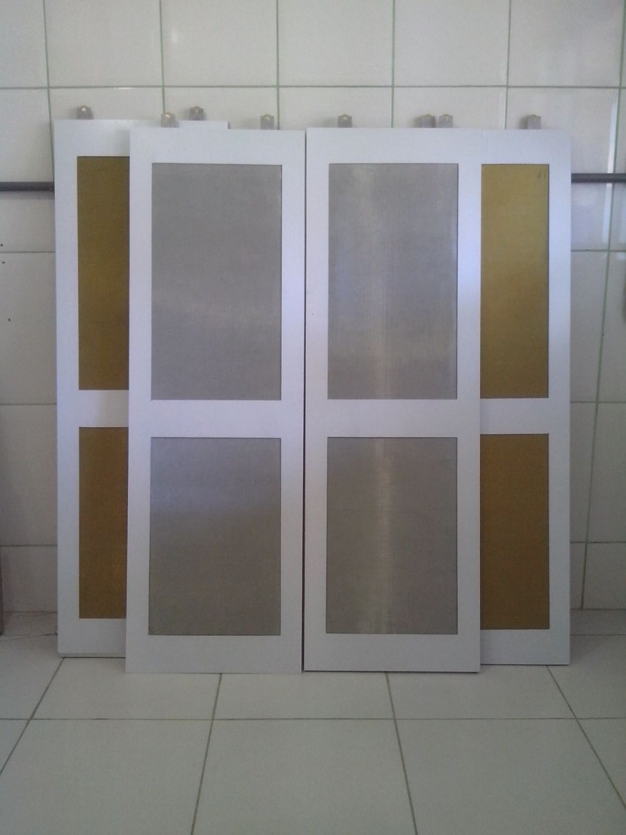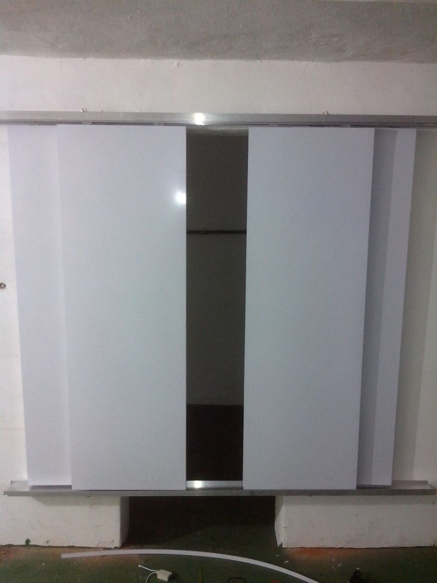 Estrutura do quadro em alumínio. Folhas de correr em acrílico branco leitoso.